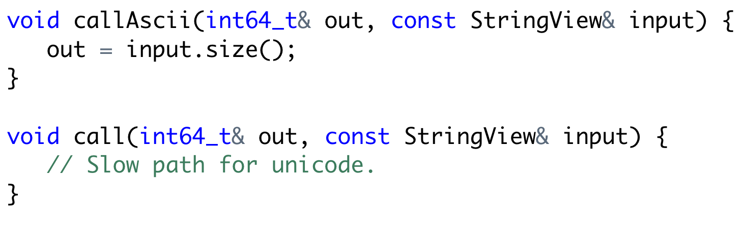 Functions with string inputs can be optimized when the inputs are known to be ascii. For example the length function for ascii strings is the size of the StringView O(1). But for non-ascii inputs the computation is a more complicated O(n) operation.