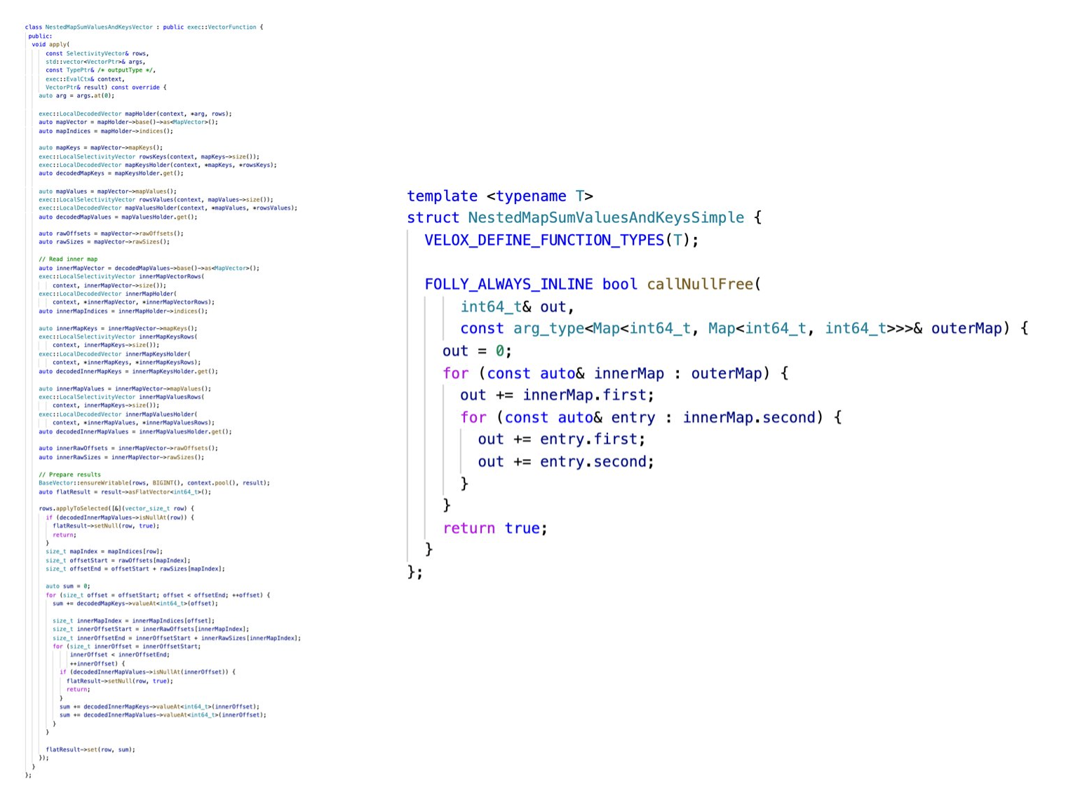 NestedMapSum function implemented using vector(left) and simple(right) interfaces.