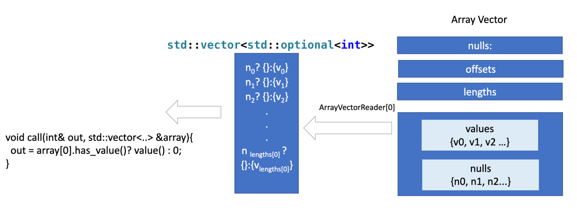 The previous approach has two key inefficiencies; Eager materialization : For each row, all the data in the input vector is decoded and read before calling the function. And Double reading, the data is read twice once when the input is constructed, and again in the function when it's used.