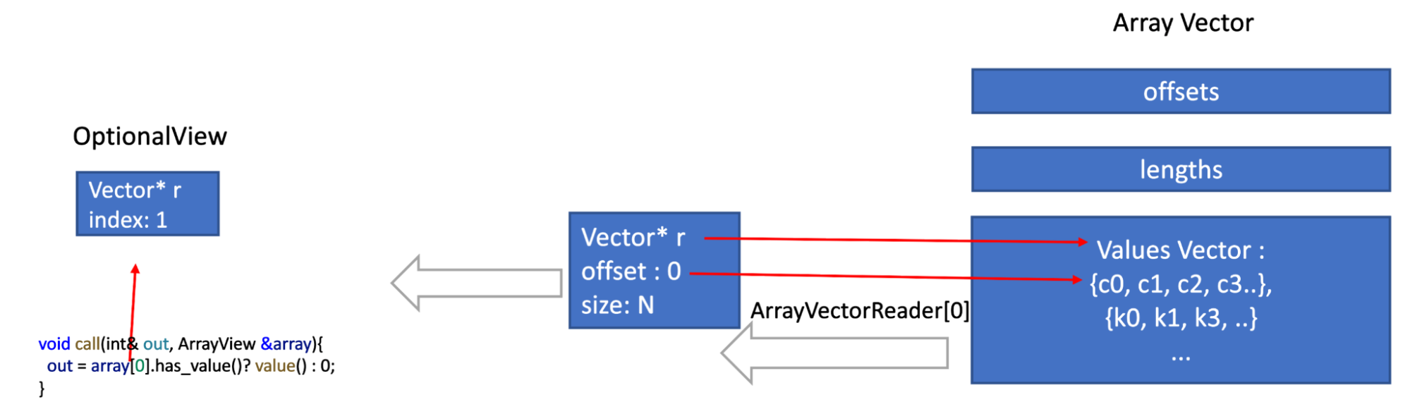 In a simplified form, an ArrayView stores the length and the offset of the array within the vector, in addition to a pointer to the elements array. Only when an element is accessed then an OptionalAccessor is created, which contains the index of the accessed element and a pointer