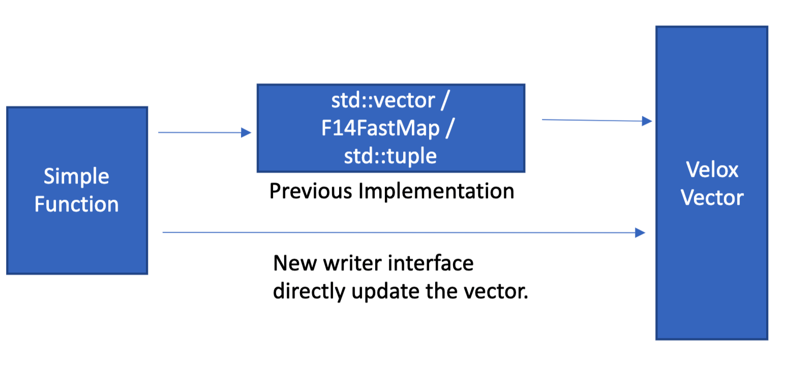 A similar pattern of inefficiency existed for functions with complex output types. The graph below shows the previous path of writing complex types through the simple function interface. In the previous path, for each row, the result is first written to a temporary object (std::vector, folly::f14FastMap<>, etc.), then serialized into the Velox vector.
