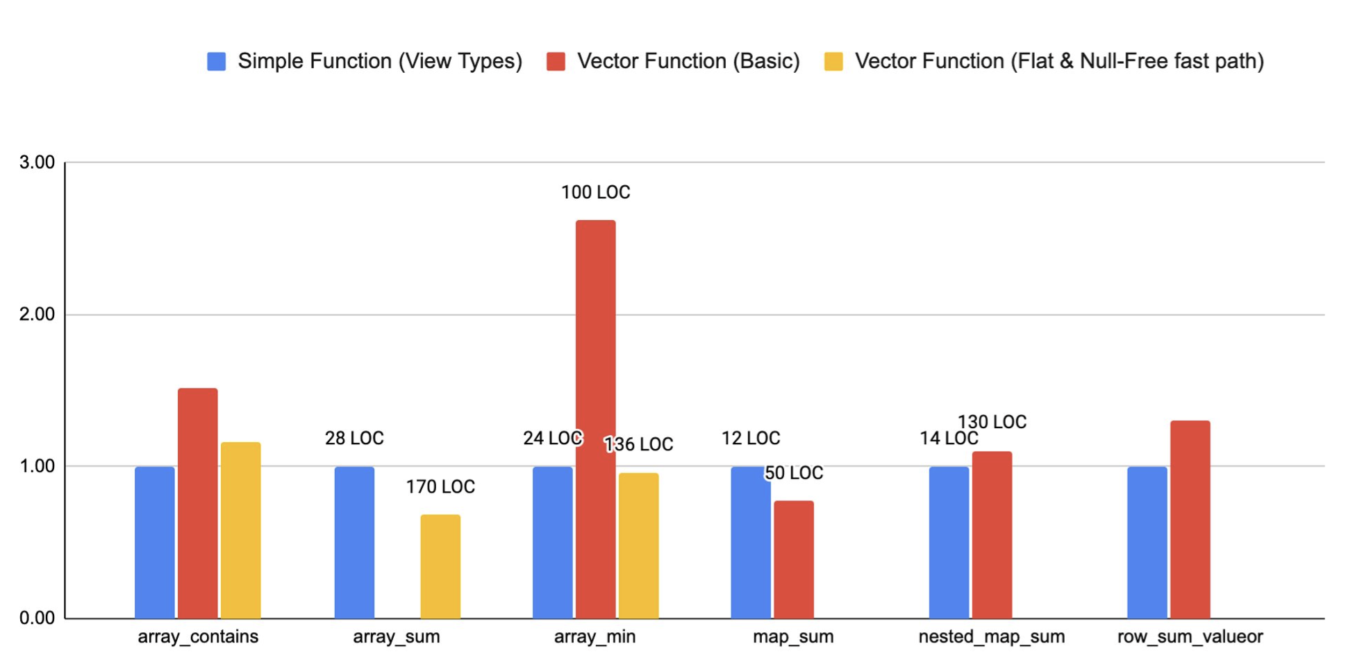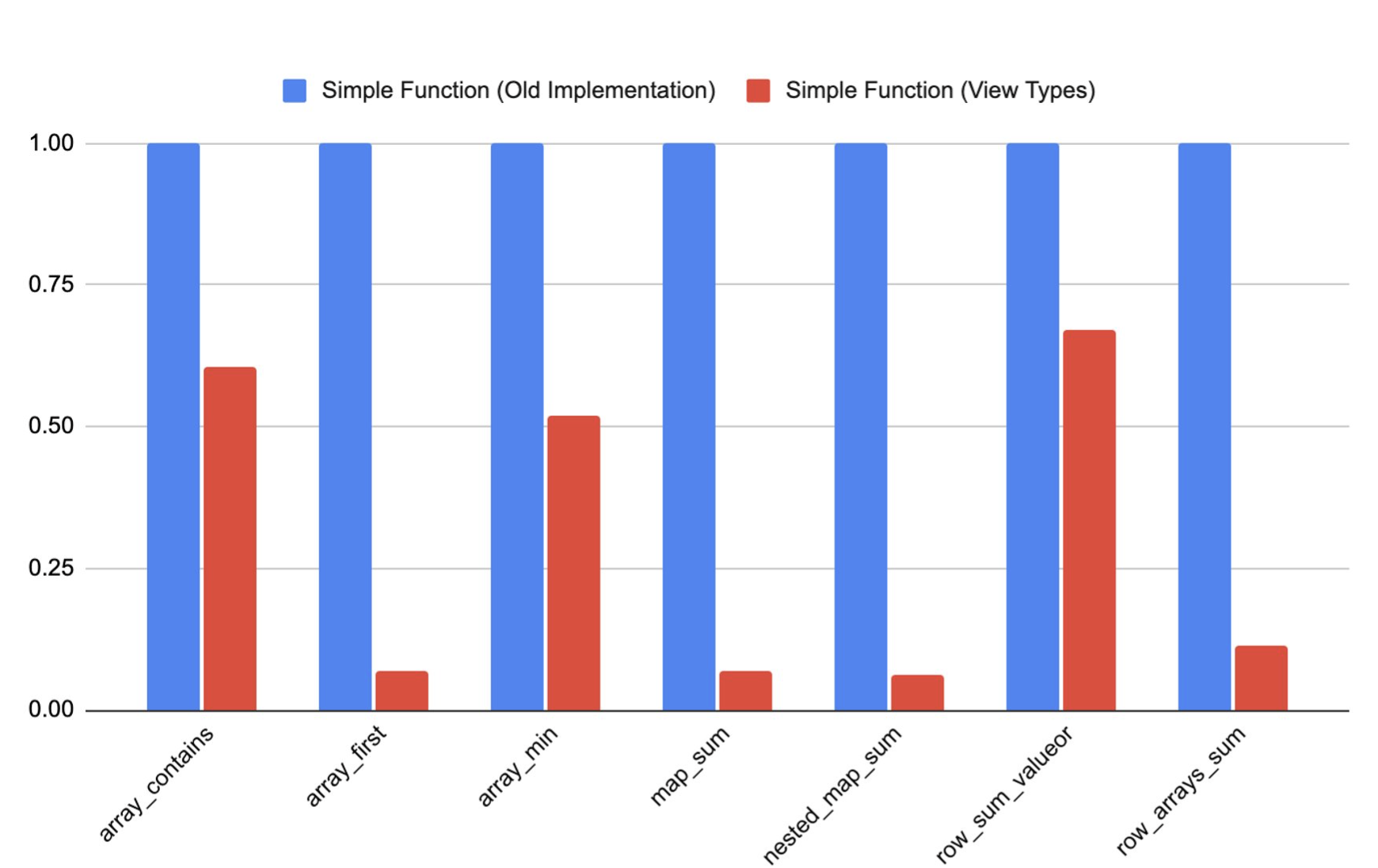 In this blogpost, we will discuss two major recent changes to the simple function interface to make its performance comparable to the vector function implementations for functions that produce or consume complex types (Arrays, Maps and Rows).