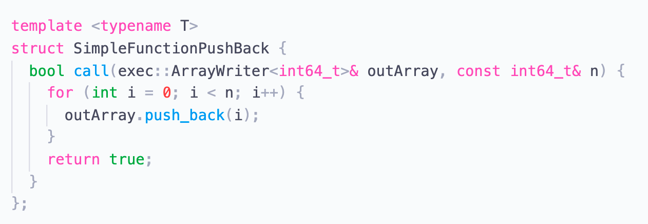 Writing functions through the simple interface mitigates the previously mentioned drawbacks, and significantly simplifies the function authoring process. For example, to add the function plus the user only needs to implement the PlusFunction struct shown in the graph above , which is then expanded using template expansion to a vector function.