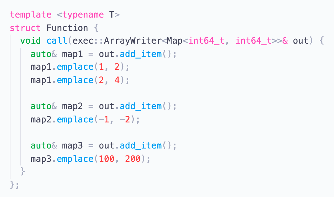 For example, for a function with an Array<Map> output , we can't add three maps, and write to them concurrently. The new interface should enforce that one map is written completely before the next one starts. This is because we are serializing things directly in the map vector, and to determine the offset of the new map we need first to know the end offset of the previous one.